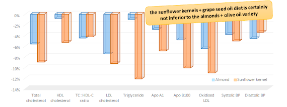 Moreover, despite a 3.4x higher MUFA:PUFA ratio the sunflower kernel + grap seed oil diet did also lead to non-significantly more pronounced improvements in blood glucose management, as well (see Figure 3). So, just in case there is are a dozen of sunflower kernels on the salad you order in a restaurant, don't freak out. They are not going to kill you - I promise ;-)