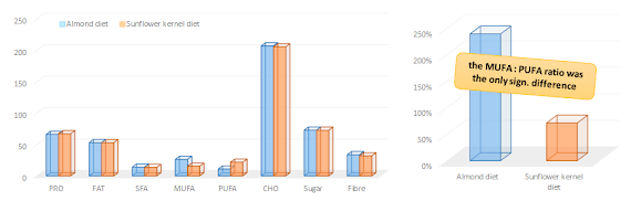 "The diets were designed to provide 30% total energy from fat of which 8% was to come from saturated fat, 15% or 9% from monounsaturated fat, and 6% or 12% from polyunsaturated fat in the AD and SKD diets, respectively. Carbohydrate and protein were to provide 51% and 17% total energy, respectively. The dietary fibre target was 25–35 g and dietary cholesterol ≤ 200mg per day." (Richmond. 2013)The 30g/day of almonds and sunflower kernels, the researchers had selected because "they have a similar amount of saturated fat per 100 g and similar total amounts of unsaturated fats", but differ in their monounsaturated (high in almonds) and polyunsaturated fat (high in sunflower kernels) content, were simply added on top of the baseline diet from Monday to Friday and had to be consumed as part of the midday meal.