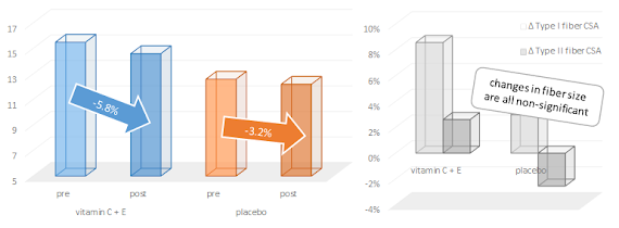 This does not mean that these effects on the body composition are "real", i.e. actually due to the provision of vitamin C + E. What it does mean, though is that the occurred, although there was no visible training effect on the mitochondrial capacity and thus in the absence of any visible / measurable training effects.