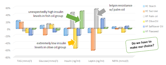 Moreover, if we abandon any paradigmatic believes, we would even have to concede that - within the current context, i.e. a rodent study and a diet with protein contents of only 19.2% (low fat) and 23% (high fat), the low fat mix of 1.25% of palm, 1.25% olive, 1.25% safflower oil, 0.625% fish and 0.625% flaxseed oil the rodents in the starch and sucrose groups received is superior to any of the high fat variants.