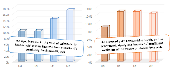 These changes went hand in hand with increases in fasting palmitoylcarnitine (=palmitic acid that's "carried" by carnitine to the mitochondria for oxidation) that signifies impaired or at least insufficient fatty acid oxidation and, last but not least, a decreased inhibition of lipolysis by insulin in the clamp condition.