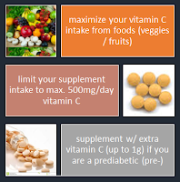 The consumption of copious amounts of supplemental vitamin C (750mg+ per day), on the other hand, must be treated with caution. In spite of the fact that there is little evidence of vitamin C induced improvements in glucose management, there is plenty of evidence to support the notion that the extra vitamin C can ameliorate the collateral damage that occurs as a consequence of the increase in glucose levels in insulin resistant / diabetic individuals.