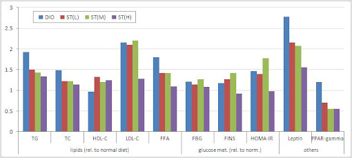 In this context it is yet worth mentioning that this study demonstrated for the first time that the aqueous dry leaves extract of Lithocarpus polystachyus Rehd. can potently reduce the worst metabolic side effects of obesity, such as the hypolipidemia, hypoleptinaemia and the degree of insulin resistance (FINS, HOMA-IR, cf. figure 3) what it does not answer, however, is whether the decline in PPAR-gamma is tissue specific, what exactly is behind the profound decline in leptin levels and whether or not lean rodents, let alone humans, who don't consume an obesogenic diet will see anywhere similar benefits.Figure 4: Effects of oral gavage of 75 mg, 150 mg and 300 mg/kg of body weight/day of sweet tea extract or placebo (DIO) in conjunction with the 8 weeks on a obesogenic diet (Zhang. 2012)