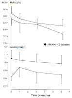 Valerio et al. report that the provision of a lipophilic form of thiamine (benzoyloxymethyl-thiamin) at 50mg/day lead to improvements in HbA1c and reduced insulin requirements in children with type I diabetes (Valerio. 1999) - the difference between the active and the placebo arm of the study did yet not reach statistical significance![]()