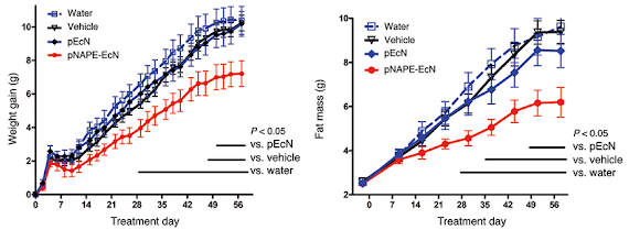 | Figure 1: Weight gain (g) and fat mass (g) in rodents on high fat diet, with water, placebo (vehicle), regular E. coli (pEcN) and NAPE-produce E.coli in the drinking water (Chen. 2014) |