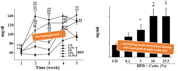 A very similar effect was observed for the accumulation of ectopic fat and oxidative stress in liver and skeletal muscle, which was present and significant on the low carbohydrate + high fat diet, but became "dramatically enhanced", only when the amount of carbs in the diet was increased.In this context it's interesting to mention that the insulin resistance was mediated primarily by an increase of the hepatic expression of key gluconeogenic genes - an increase that was most dramatic by HFD with little carbs. This, as well as the previously cited fact that the occurrence of muscular and hepatic insulin resistance in a cell study depended on the the presence of fatty acid lead Mei et al. to conclude that (a) "dietary carbs are not necessary for HFD to induce insulin resistance but can aggravate insulin resistance in a dose-dependent manner"; and (b) "HFD [in this case really high fat, low carb] alone causes insulin resistance in liver and skeletal muscle with or without dietary carb." (Mei. 2014)
