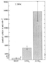 | Figure 2: Urine urea levels after working out in a glycogen replete (CHOH) vs. depleted (CHOD) state (Mullin. 1980) |