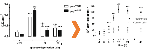 | Figure 1: Glucose deprived and thus stressed muscle cells increase mTOR and p70S6K and show an increase in protein synthesis after only a short time of "running on empty" (Miniaci. 2014) |