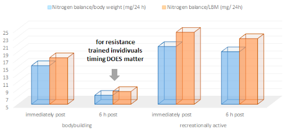 Are urine collections valid measures of protein retention? I would prefer a 12-week study that measures the net muscle gain in response to immediate vs. 6h post supplementation as well. In the end, the 3+ day urine collection is probably still a better measure of the amount of protein that's actually used to "build lean mass" (remember this way we cannot distinguish where the protein was stored - we only know that is was not metabolized and excreted!) than the acute measures of protein anabolic signalling you see in many other studies - a measure of which Mitchell et al. have shown that it does not correlate with resistance training-induced muscle hypertrophy in young men (Mitchell. 2014), only recently.