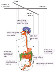 If microbial control is mediated through the vagus nerve, then microbial signals should interfere to some extent with the physiological regulation coordinated by the vagus nerve. [...] We predict that people experiencing cravings should have lower vagal tone. Furthermore, it is possible to block or sever the vagus, which we predict would subdue microbial signaling via the vagus nerve, and thereby alter food preferences. This would be consistent with studies showing that blocking the vagus nerve can lead to weight loss." (Alcock. 2014)In conjunction with the aforementioned effects and the influence of population size and composition on cravings and high fat, high carbohydrate preferences foods Alcock et al. believe to have enough evidence for the existence of what they call an "evolutionary conflict between the host and microbiota" which may lead to cravings and cognitive conflict with regard to food choice.