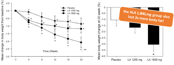 In said study, 360 obese individuals (body mass index [BMI] ≥30 kg/m2 or BMI 27-30 kg/m2 plus hypertension, diabetes mellitus, or hypercholesterolemia) were randomized to alpha-lipoic acid 1200 or 1800 mg/d or placebo. The supplement was consumed in three doses of 600mg timed 30 minutes before a meal. Now in my past articles I have often pointed out that supplement timing may be overrated. In the case of ALA it does yet make perfect sense for diabetics and insulin resistant obese people (!) to take it before a meal, in order to benefit from the insulin sensitizing effects of the AMPK activator alpha lipoic acid.