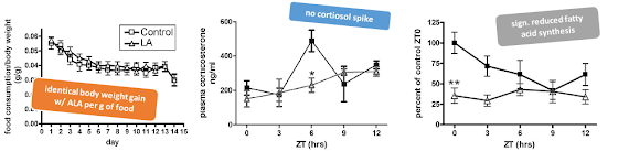 | Figure 1: ALA had no direct weight loss effect, but it reduced the abnormal cortisol excursions and the increase in postprandial fatty acid synthesis in the old rodents (Keith. 2014) |