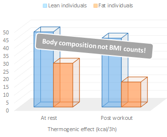 In addition to the overall effect size, the data in Figure 2 does also indicate that an "over night" effect, as well as the increase in energy expenditure during workouts were likewise only observed in the lean, not in the obese women (since the lack of thermogenesis has been associated with decreased insulin sensitivity using 300-500mg of alpha lipoic acid, as I have suggested in a recent article, may ameliorate the reduction in postprandial thermogenesis).