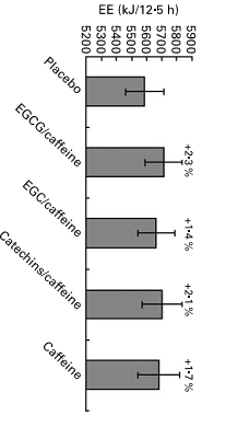 Caffeine + EGCG make a powerful team, but... In a 2009 studies, scientists from the University of Kopenhagen found that EGCG, the best known of the dozen of green tea catechins is an excellent synergist to caffeine, my recommendation from the last installment of this series and increases. The data Gregerson et al. present in the May issue of the British Journal of Nutrition does yet also show that (a) the other catechins work as well, and (b) caffeine, not EGCG is the #1 metabolic energizer (150mg caffeine alone ➭ 1.7% increase in energy expenditure vs. caffeine + EGCG ➭ 2.3% increase in energy expenditure).