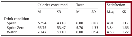 | Table 4: Descriptive statistics for participants’ food ratings and calorie consumption by drink condition (Hill. 2014). |