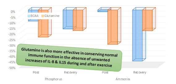 The creatine kinase levels (a marker of muscle damage) and the levels of interleukin-8 and interleukin-15, however, were significantly lower in the glutamine than they were in either the BCAA or placebo group. This is a result of which the authors of the study believe that, it may..."[...]represent the effects of energy supplementation from glutamine supply, which activated as a fuel in the muscle and as a nitrogen precursor for nucleotide synthesis" (Koo. 2014).An alternative explanation would be that glutamine (probably via its connection to glutathione; see Roth. 2002) had a direct protive effect on the skeletal muscle tissue during the workouts.