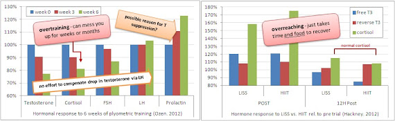 (Hackney. 2012b) -- In fact the results of two subsequently published papers by Hackney et al. would suggest that it's about as easy. Work out hard and fast and see greater increases in testosterone levels, but also testosterone turnover (into DHT via 5-alpha reductase), but don't forget that aside from these (questionable) anabolic benefits, your thyroid hormone levels are going to take a dive (as reported previously), as well.| Figure 1: Comparison of the hormonal responses measured in the plyometrics (left) and the HIIT vs. LISS (right) study (based on Ozen. 2012 and Hackney. 2012) |