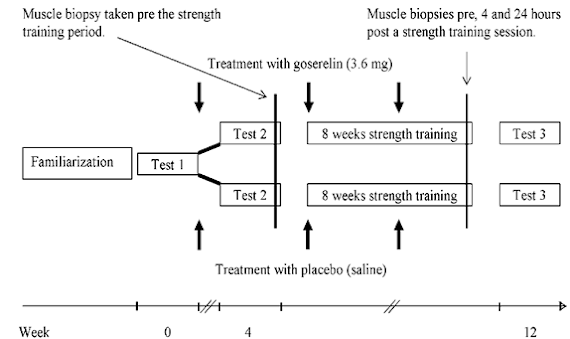 "A standardized warm-up was performed before training consisting of 4 sets of squats with 20 repetitions without load and with 1 min rest between sets. Subjects from both groups trained using the same progressive strength training program. The programs were performed 3 times a week for 8 weeks and consisted of leg press, knee extension, leg curl, bench press, lat pull down, biceps curl, and elbow extension. Subjects did 4 sets of each exercise for the lower body and 3 sets of each exercise for the upper body. The strength training period consisted of 24 training sessions periodized in 3 cycles of 8 training sessions with changing training loads (6 RM – 10 RM). The goserelin group and the placebo group increased training loads to the same extent and underwent the same training volume." (Kvorning. 2014)In contrast to the training stimulus, which was identical for both groups, the intra-muscular response to the workout differed significantly between the young men in the goserelin group (10-20x reduced testosterone levels) and their peers in the placebo group: