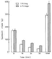 | Figure 3: When men are offered a sandwiches with identical or varied (4 different) fillings, they will consume significantly more if they are allowed to switch back and forth between the different fillings (Rolls. 1981). |