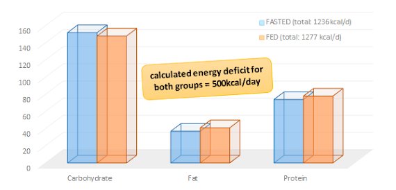 Subjects were provided with customized dietary plans designed to induce a caloric deficit. In that, their total caloric intake was calculated on the basis of the Mifflin-St. Jeor Equation, which yields adequate, but obviously not 100% precise measurements of the resting metabolic rate (max. 10% off in non-obese adults according to Frankenfield. 2005). Since the same method was used for both groups, any possible inaccuracies, due to which the real caloric deficit among the women may not be identical to the calculated one, should carry no real weight, though. And we can simply assume that all women were in the same ~500kcal/day energy deficit the researchers thought to create.![]() |