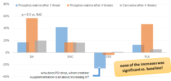 Against that background I would like to point out that the study at hand does not indicate that either beta alanine or creatine are useful. What it does, thought, is to remind us of the fact that (a) you won't see results over night and (b) even beta alanine and creatine are exercise-specific ergogenics and won't boost your performance an each and every type of exercise to the same extent. Or what do you think are the implications? Comment on Facebook!
