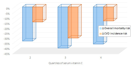 What do previous studies say? Randomized controlled trials did not show significant reductions in mortality risk with vitamin C supplementation (Bjelakovic. 2007). A subsequently published Cochraine Review even found slight reductions in all-cause mortality in healthy individuals who use vitamin C supplements (+2%; Bjelakovic. 2012). Higher total vitamin C intakes from food have yet been linked to 35% and 10% reductions in all-cause mortality risk in US men and women, respectively (Enstrom. 1992).