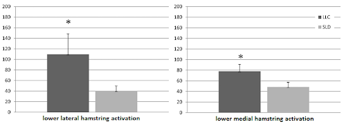 In their study which used surface electromyography to record mean normalized muscle activity of the upper lateral hamstrings, lower lateral hamstrings, upper medial hamstrings, and lower medial hamstrings, the lying leg curl (LLC) elicited significantly greater normalized mean activation of the lower lateral and lower medial hamstrings compared with the stiff-legged deadlift (SLDL) (p ≤ 0.05).