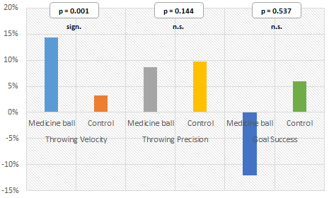 | Figure 3: Changes in throwing velocity (significant difference), throwing performance (non significant) and goal success (non significant) in response to medicine ball vs. control training (Reader. 2015). |