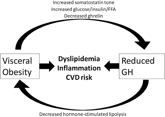 | Figure 1: Self-reinforcing cycle of increased visceral fat and reduced GH in states of abdominal obesity (Stanley. 2014). |
