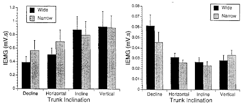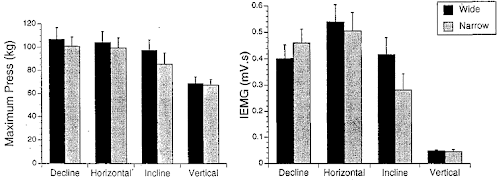 Six male weight trainers performed presses under four conditions of trunk inclination and two of hand spacing at 80% of their predetermined max. Preamplified surface EMG electrodes were placed over the five muscles in question. The EMG signals during the 2-sec lift indicated some significant effects of trunk inclination and hand spacing (see Figure 3, as well).