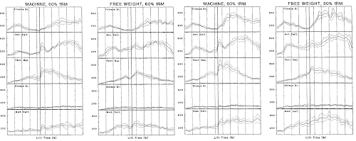| Figure 4: Comparison of the muscle activity during free weight and machine guided bench presses - please not that the differences reached significant only for the low = 60% 1RM weight (McCaw. 1996). |