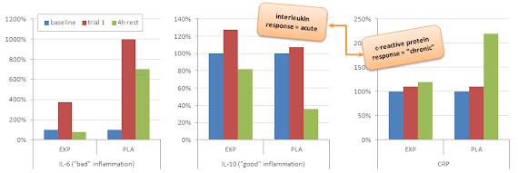 If you add the cytokine expression in the steady state 2h trial from figure 1 to the data that was recorded after the completion of the 1h steady state + time trial cycling session four hours later and the 48h post levels of the inflammatory markers, the resulting graph exposes a very neat symmetry with an almost identical rise and fall in the expression of the short-lived cytokines and an eye-catching difference in the intermediate inflammatory response evidenced by the increase in CRP in the recovery phase of the placebo trial (just as a reminder: C-reactive protein aka CRP is the same stuff you will also see chronically elevated in diabesity and all sorts of inflammatory diseases).