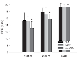 More importantly, however, the NaHCO3 ingestion also lead to significant reductions in the rate of perceived exertion (P < 0.05) during the Yo-Yo IR2 test in comparison to CAF and PLA trial.
