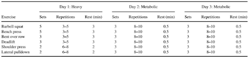 Now, I have to admit that due to the lack of a "HMB + whey only" group it is difficult to tell how much of any potential benefits the subjects in the WHI group may have experienced can be ascribed to HMB. As we are going to see in the discussion of the results, a comparison to previously observed effects of HMB do yet suggest that the addition of HMB may have had an effect,... but hey, I am anticipating here. Let's first take a closer look at what exactly the researchers from the Ohio State University did."Thirteen resistance-trained men (age: 22.6 +/- 3.9 years; height: 175.3 +/- 12.2 cm; weight: 86.2 +/- 9.8 kg [at least one year of RT experience]) completed a double-blinded, counterbalanced, within-group study. Subjects ingested EAS Recovery Protein (RP; EAS Sports Nutrition/Abbott Laboratories, Columbus, OH) or WP twice daily for 2 weeks prior to, during, and for 2 days following 3 consecutive days of intense resistance exercise" (Kraemer. 2015).The workout sequence included heavy resistance exercise (day 1) and metabolic resistance exercise (days 2 and 3 | see Table 1 for details) and was specifically designed to provide "excessive demands" on the recovery process.