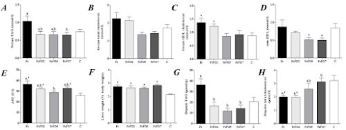 Male Wistar rats were separated into two groups: Control (C, n = 6) and Fructose (Fr, n = 32), the latter receiving a diet containing 63% by weight fructose for 60 days. After this period, 24 animals from Fr group were allocated to three groups: FrFO2 (n = 8) receiving 63% fructose and 2% FO plus 5% soybean oil; FrFO5 (n = 8) receiving 63% fructose and 5% FO plus 2% soybean oil; and FrFO7 (n = 8) receiving 63% fructose and 7% FO. Animals were fed these diets for 30 days.