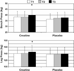 Figure 2: Increased bench press and leg press strength in response to one week supplementation w/ 0.3g/kg creatine monohydrate in thirty 58–71 year old women (Gotshalk. 2008).