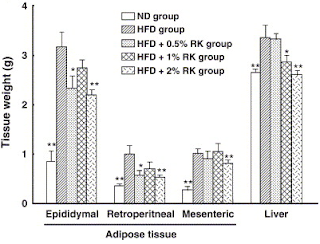 | Effect of raspberry ketone liver and visceral adipose tissue weight (B) in mice fed a high-fat diet for 10 wks (Morimoto. 2005). |