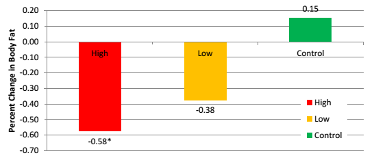 body fat percentage in the high treatment group (p = 0.007) as presented in Figure 1. Additionally, no significant difference was found in the low treatment group (p= 0.359), nor the control, or placebo, group (p = 0.405).