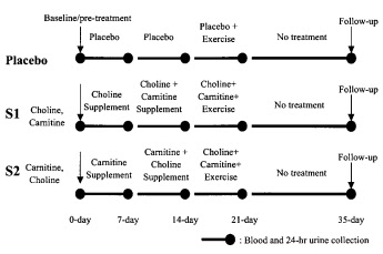 For a follow up study, the scientists recruited 19 healthy non-obese women with no history of diabetes, or cardiovascular disease (18–54y; body weight, 47.5–92.7 kg; body mass index (BMI), 18.9–35.9kg/m²; body fat, 17.9–37.8%) and repeated the experiment (Hongu. 2003); yet with a slightly different design (see figure 2) that would allow the researchers to differentiate the individual effects of choline and carnitine - unfortunately, without the third "C", i.e. the caffeine.