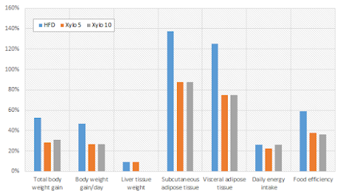 - a reduction of the genes that are responsible for the storage of fat to normal (5%) and sub-normal (10% D-Xylose) levels, and