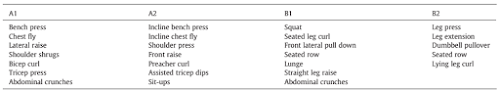 Participants alternated among exercises from groups A1, A2, B1 and B2 shown in Table 2. Participants were asked to rest for ~ 2 min between sets and were instructed on proper breathing techniques.![]()